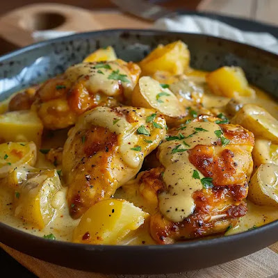 Îndrăznește să încerci această rețetă și bucură-te de deliciile puiului auriu cu cartofi copți în sos cremos de brânză!